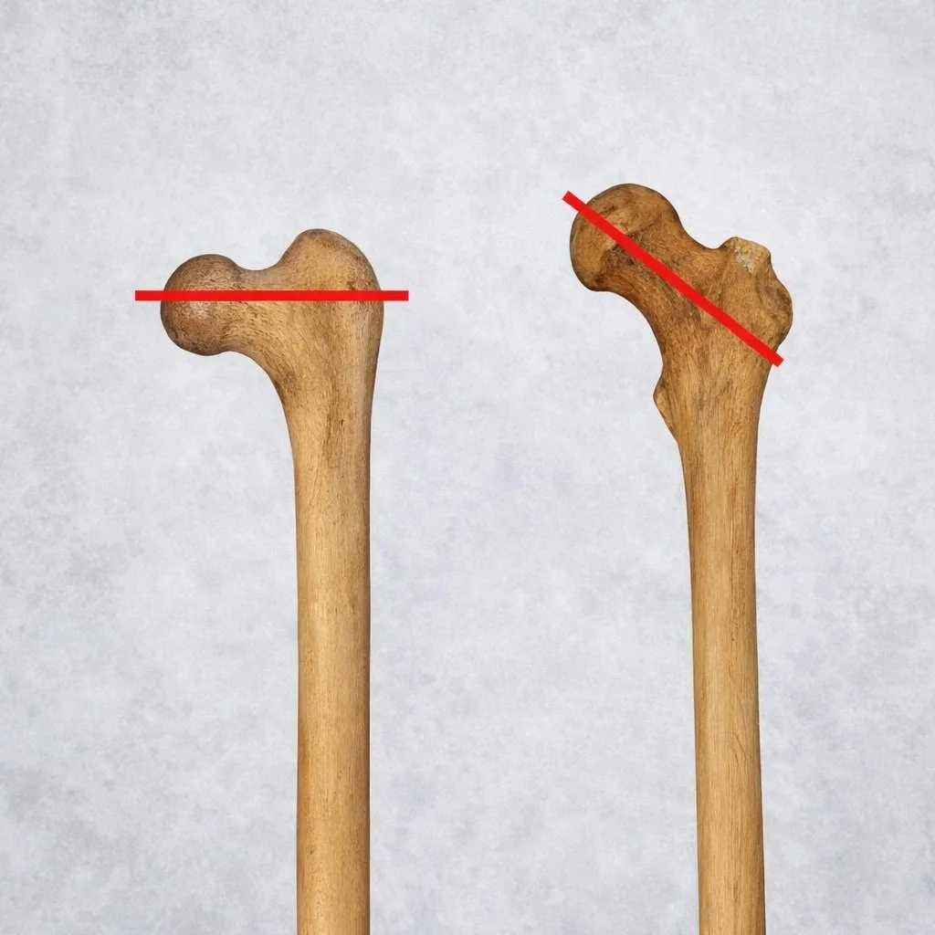 Two left femurs. The inclination of the neck is 40° different. The ability to abduct would be 40° different. For more examples visit Yoga Studies with Paul and Suzee Grilley.