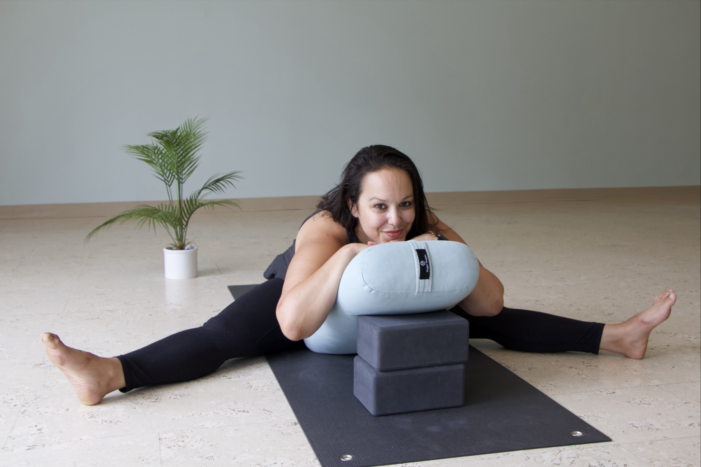 Jess demonstrates the use of props in a wide-legged forward fold.