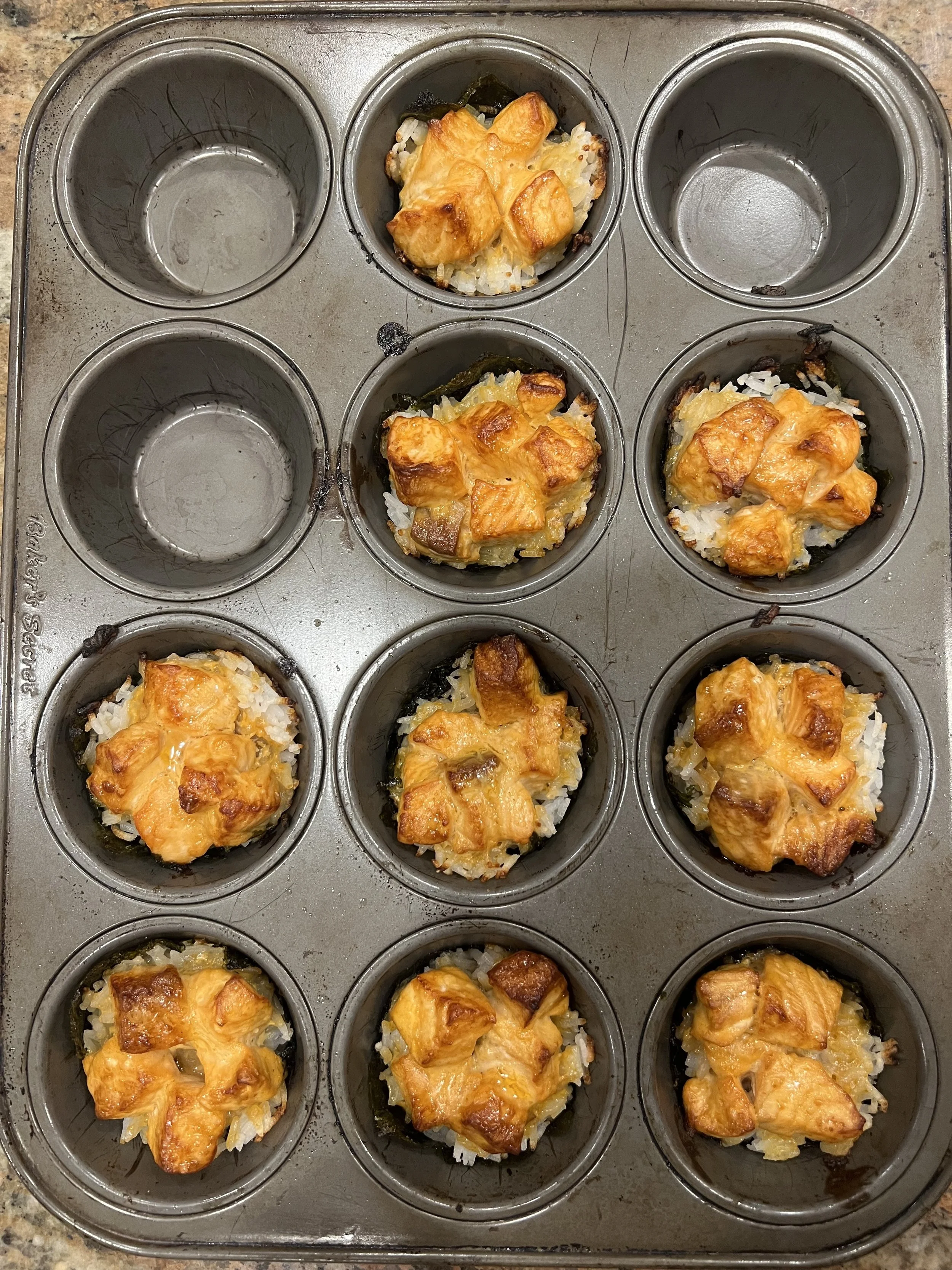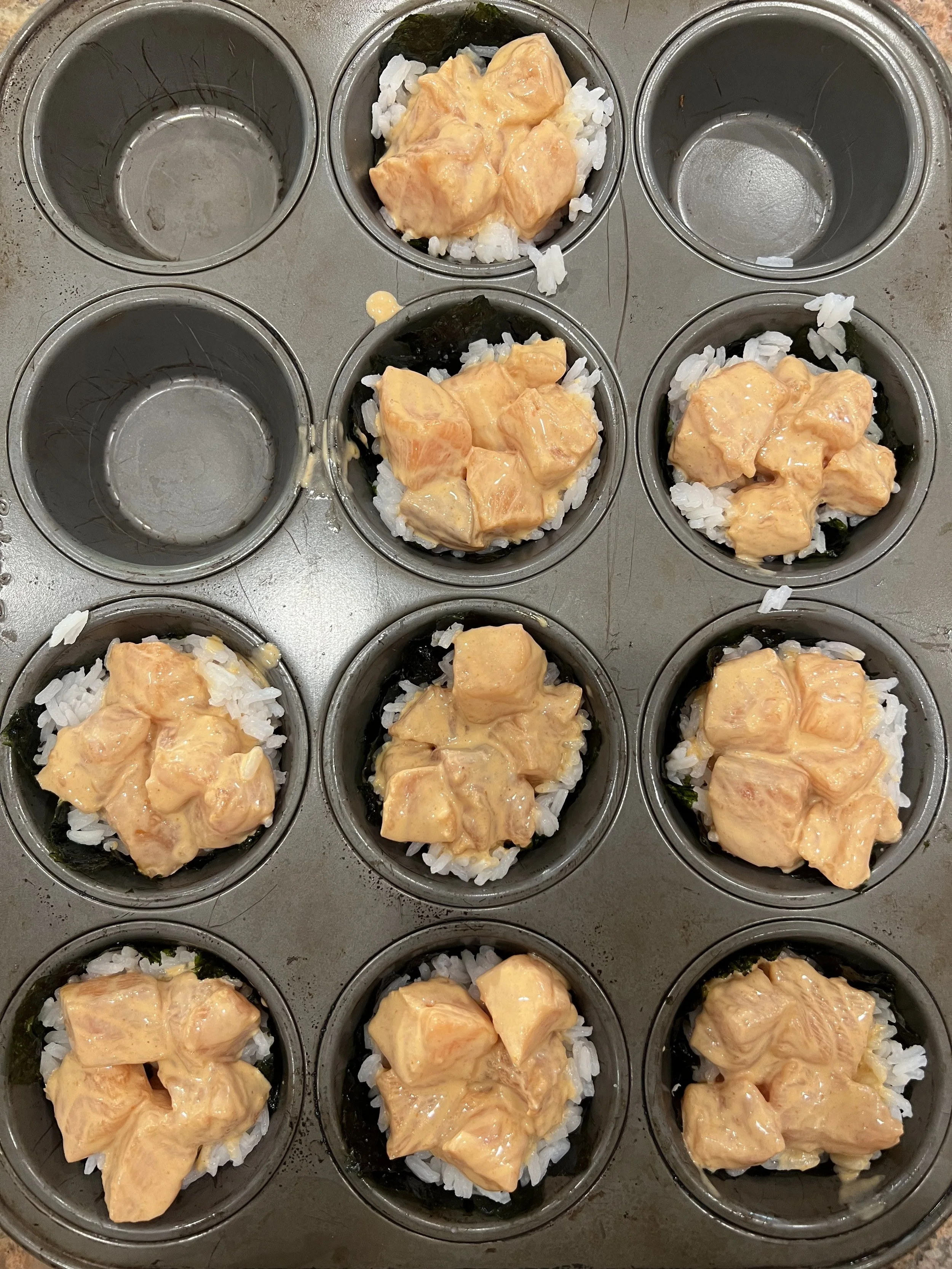 Remove the muffin pan from the oven, cool slightly, and carefully scoop out each baked sushi cup onto a plate.