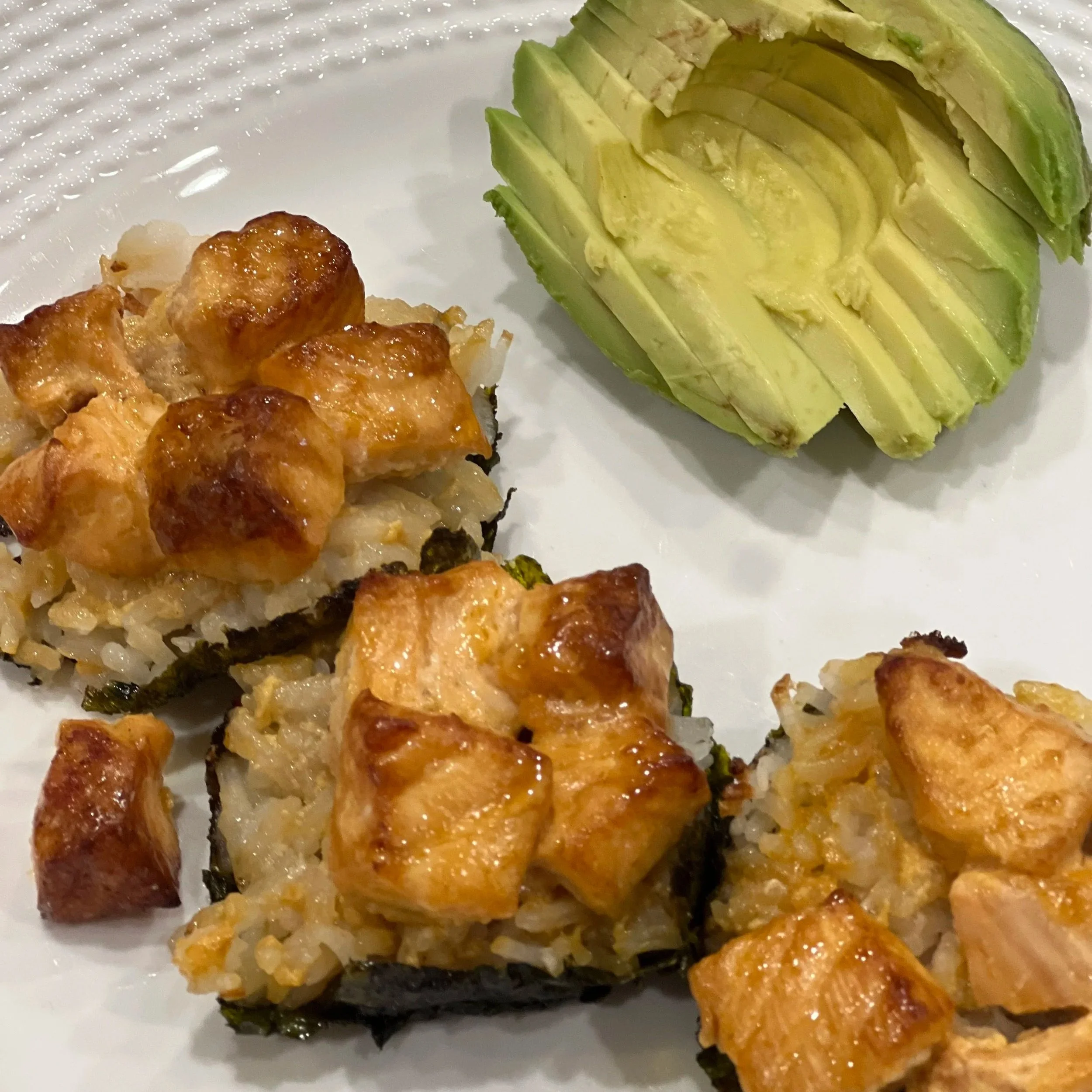 In a medium bowl, place salmon cubes, soy sauce, mayonnaise, and sriracha. Gently fold to mix and coat the salmon evenly. Set aside to marinate while rice cooks and you prepare the remaining ingredients.